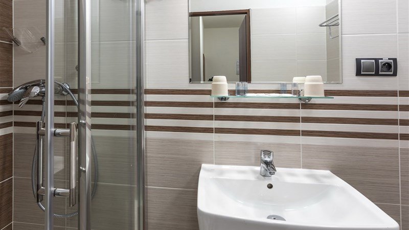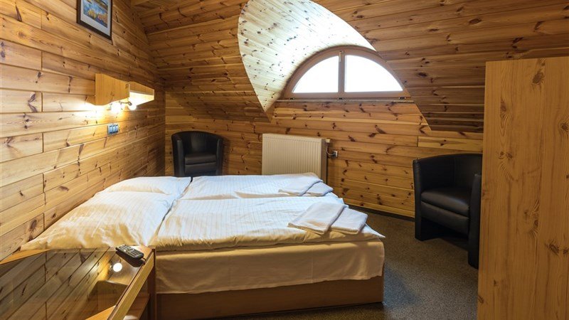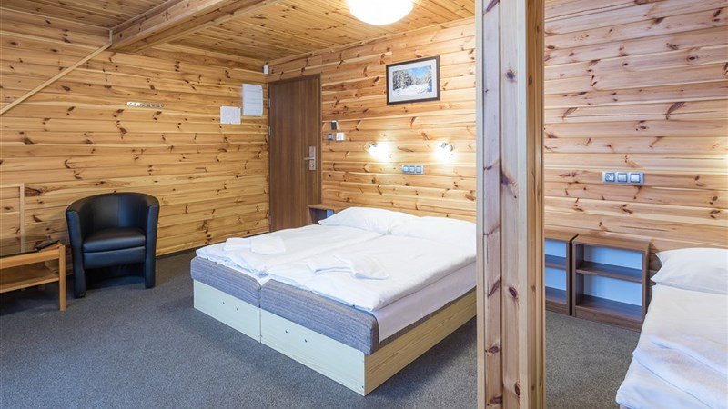 a) 2 – lůžkové pokoje, Spr.+WC, SAT/TV, Wi-Fi b) 3 – lůžkové pokoje, Spr.+WC, SAT/TV, Wi-Fi **c) Apartmán pro 4 os. **: Spr.+WC, SAT/TV, 2× ložnice (v každé 2 lůžka), Wi-Fi **d) Apartmán pro 5 os. **: Spr.+WC, SAT/TV, 2× ložnice (v jedné 2 lůžka, v druhé 3 lůžka), Wi-Fi Wi-Fi má omezená kvalita vzhledem k lokalitě umístění hotelu. Balkony: u 3 pokojů (1× dvoulůžkový a 1× třílůžkový pokoj – společný balkon. 1× apartmá pro 4 osoby – samostatný balkon). Pouze jako nezávazné přání klientů. Pokoje na ověření.