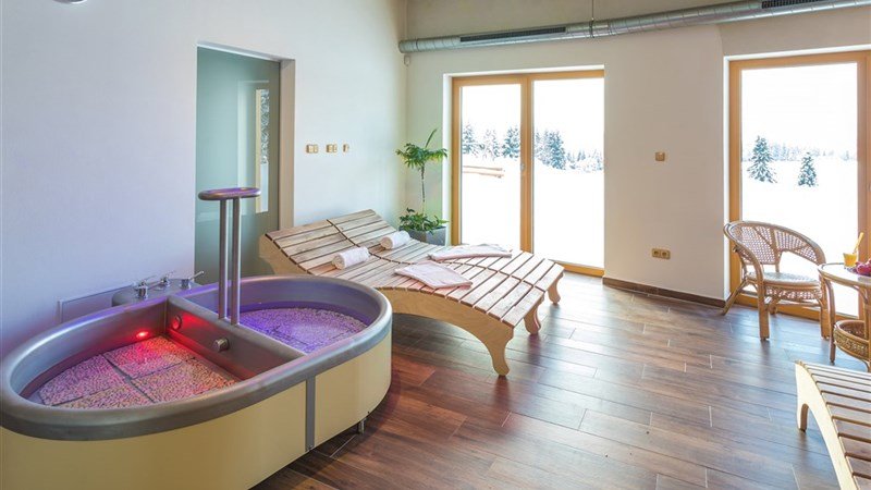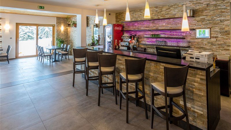 Recepce, restaurace s letní terasou, parkoviště, Wi-Fi v celém objektu (omezená kvalita vzhledem k lokalitě), dětský koutek, úschova lyží a kol, hřiště na fotbálek, volejbal, dětské hřiště a pískoviště Wellness centrum: finská sauna, Infrasauna, Biosauna a Kneippova lázeň, možnost objednání masáží (klasická, medová, lávovými kameny aj.)