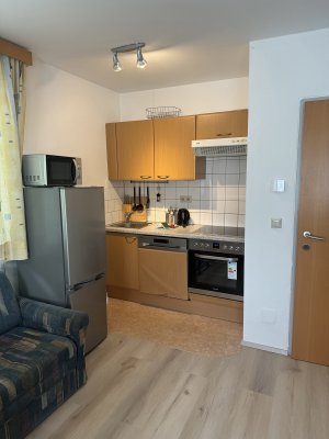 s částečně odděleným kuchyňským koutem, rozkládacím gaučem pro