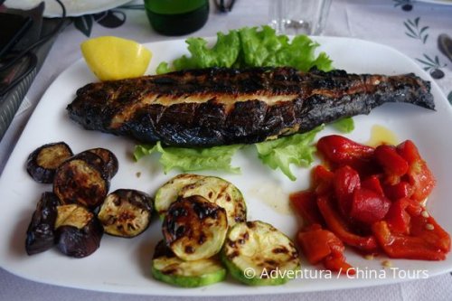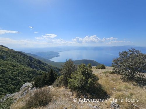 Horská etapa přes NP Galičica (55 km / ↑1300 m / střídavě asfalt a šotolina) nebo vyhlídková trasa podél jezera (30 km / ↑500 m / asfalt); prohlídka kláštera Sv. Nauma a mohutné vyvěračky s křišťálově čistou vodou, která pod zemí přitéká z výše položeného Prespanského jezera; přejezd do Albánie a ubytování v „letovisku“ Pogradec.