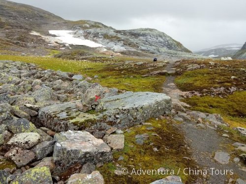 4. denVýstup na Galdhøpiggen (2469 m) – nejvyšší horu Norska a celé severní Evropy (12 km / ↑1400 m / ↓1400 m / 7,5 h): z horské chaty Spiterstulen (1100 m) se vydáme po stezce podél horských potůčků rozlehlým svahem se stády ovcí a s výhledy do údolí na východní výstupový hřeben, dále po hřebeni překonáme sněhové pole nad ledovcem Styggebreen a v závěru zdoláme první vrcholek Keilhaus topp (2355 m) a pak i samotný Galdhøpiggen; návrat stejnu cestou k horské chatě a přesun na nocleh do oblasti norských fjordů. Alternativně výstup jen na vyhlídkový východní hřeben (7,5 km/ ↑ 950 m/ ↓ 950 m) nebo odpočinková vycházka v okolí chaty.