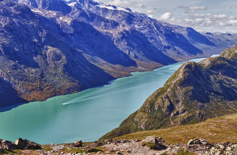 3. den: Brzká snídaně. V dnešním dni nás čeká tzv. norská národní túra – přechod hřebenem Bessegen nad jezerem Gjende. Tato náročná celodenní túra v národním parku Jotunheimen je jedna z nejkrásnějších tras nejen v Norsku. Ráno doplujeme po jezeře Gjende na chatu Memurubu, odkud se vydáme zpět přes hřeben Besseggen. Po náročném výstupu na vrchol Vestfjellet budeme odměněni výhledy na vrcholy pohoří Jotunheimen, náhorní plošinu Valdresflya a na krásné ledovcové jezero Gjende. Sestup zpět končí u horské chaty Gjendesheim. Délka túry je asi 8 hodin. Méně zdatní mohou samostatně uskutečnit asi 5hodinovou túru z chaty Gjendesheim (tam a zpět stejná trasa) anebo na chatu Bessheim, kam pro ně přijede autobus.