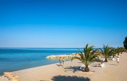Oblázková, kamenitá a dlážděná pláž s pozvolným vstupem do moře se nachází cca 50–250 od mobilhomů (v závislosti na umístění mobilhomu). K dispozici je zde plážový servis za poplatek (ceník na místě). K dispozici je zde plážový servis za poplatek (dle místního ceníku). Těšit se můžete na pláže oceněné Modrou vlajkou, která značí čistotu a kvalitu pláže. Na pláži je široká nabídka vodních sportů a nafukovací vodní park pro děti.