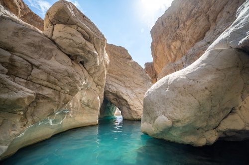 v Ománu Wadi Shab s možností koupání. Na cestě zpět do Muscatu se
