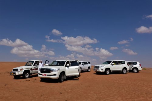 přesun v konvoji terénních vozů do jedinečné barevné pouště Wahiba