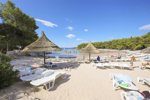 Kolem resortu se táhne krásná přírodní písčitá pláž s pozvolným vstupem, která je hlavní atrakcí tohoto resortu a díky tomu je resort velmi vhodný také pro rodiny s dětmi. Kromě toho jsou zde také skalnaté pláže a pontony pro opalování a skoky do vody. Na pláži jsou k dispozici také lehátka dle dostupnosti (omezená kapacita) a mnoho vodních sportů. Pro ty, co vyhledávají FKK pláž, jen cca 1 km je vzdálená pláž Kozarica.