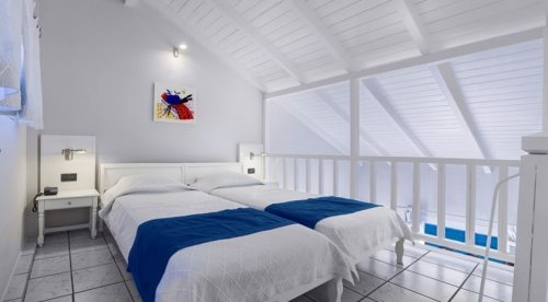 Hotel nabízí ubytování v pokojích dvou typů v několika kategoriích (standardní pokoje a mezonetové pokoje). Dvojlůžkové pokoje (21 m2, postel queen size) s možností 1 přistýlky mají sociální zařízení se sprchou nebo vanou, vysoušeč vlasů, toaletní potřeby, klimatizaci, SAT/TV, rádio, telefon, trezor, minilednici, Wi-Fi připojení, stolek a křeslo, balkón nebo terasu (výhled na zahradu, boční nebo přímý výhled na moře). Mezonetové pokoje s ložnicí v patře mají stejné vybavení, jsou o něco prostornější a mají kapacitu 2–4 osoby.