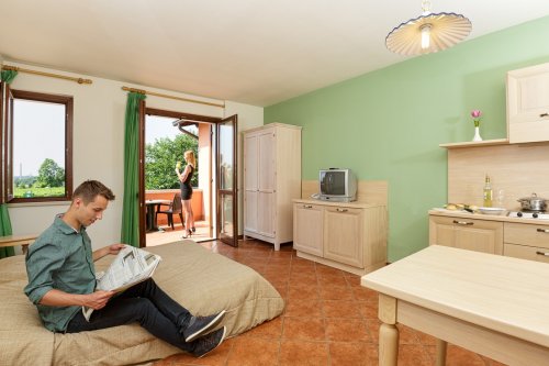 Vybavení apartmánů: vkusně vybavené apartmány, disponují následujícím vybavením: balkón nebo terasa, koupelna se sprchou a WC, obytná místnost s kuchyňským koutem, jídelní stůl a židle, lednice, TV/sat, klimatizace (od poloviny června do poloviny září) Apartmán typu MONO pro 2 osoby (29m2): obytná místnost s kuchyňským koutem, rozkládací gauč pro 2 osoby Apartmán typu BILO pro 4 osoby (cca 40m2): obytná místnost s kuchyňským koutem, rozkládací gauč pro 2 osoby, ložnice s manželskou postelí Apartmán typu TRILO pro 6 osob (cca 50m2): obytná místnost s kuchyňským koutem, rozkládací gauč pro 2 osoby, ložnice s manželskou postelí, pokoj se 2 samostatnými lůžky