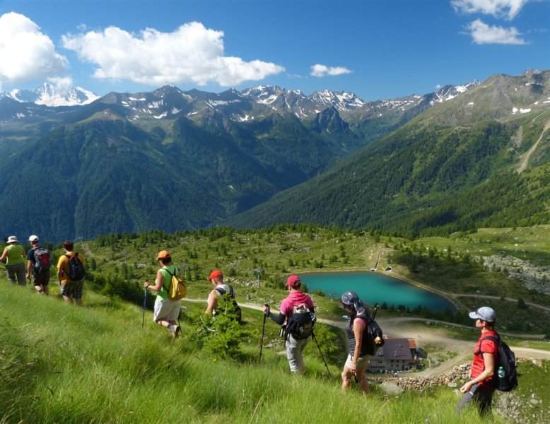 4. den: Snídaně, základní varianta (2 z 5; 6 hod., 600 m): výstup k ledovci kolem jezera LAGO DEl MONTICELLO (2 599 m) a lanovkou k hotelu. Lehčí varianta (1,5 z 5; 4 hod., 100 m, 100 m): lanovkou k chatě CAPANNA PRESENA (2 573 m), procházka po ledovci, lanovkou zpět do hotelu, odpoledne relaxace v sauně či páře, večeře.