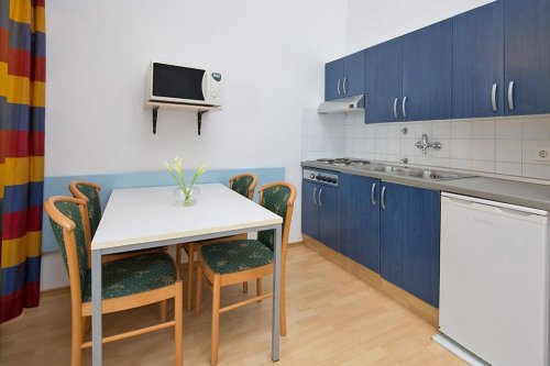 Apartmán o výměře cca 44 m2 disponuje vlastním sociálním zařízením, ložnicí se 2 oddělenými lůžky, obývacím pokojem s pohovkou pro 2 osoby, vybaveným kuchyňským koutem s lednicí a balkonem s posezením. Minimální obsazení apartmánu jsou 3 osoby, maximální obsazení jsou 3 dospělé osoby a dítě do 13,99 let. V apartmánu lze ubytovat dítě do 1,99 let na lůžku s rodiči zdarma.