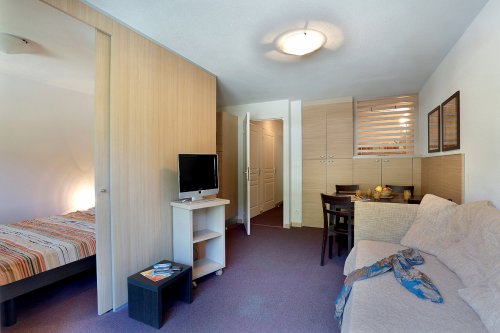 - Studio 4 30 m² – obývací pokoj s kuchyňským koutem a rozkládacím gaučem pro 2 osoby (možno i typ „šuplík“), kabina či vstupní místnost se 2 samostatnými lůžky, sociální zařízení s vanou, zpravidla balkon či terasa