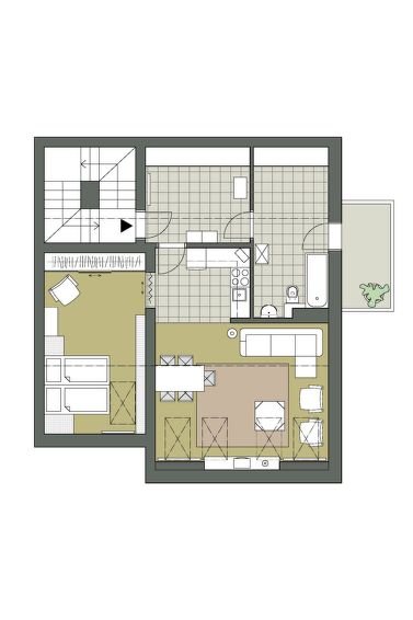 2-pokojový podkrovní byt 60 m2 v 2. patře. Pěkné a útulné zařízení: zkosený, otevřený obývací pokoj/jídelna 23 m2 s 1× pohovka pro 2 osoby (160 cm v délce 200 cm), jídelní stůl, TV-satelit, video a rádio. 1× zkosený pokoj 16 m2 se střešní okno s 2× lůžko (80 cm, v délce 200 cm), klimatizace. Otevřená kuchyně (4 plotýnky, myčka, mikrovlnka, mraznička, elektrický kávovar). Koupelna/WC. E-topení. Balkon 4 m2, jihovýchodní orientace. Zahradní nábytek. Výhled do zahrady. K dispozici: pračka, žehlička. Internet (Wireless LAN [WLAN], zdarma).
