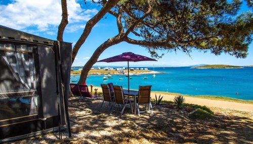 Celý výběžek, na kterém se kemp nachází, je obklopen převážně skalnatými plážemi se snadným přístupem do moře a krásným výhledem na malé ostrůvky v moři. Nachází se zde také mnoho zátok s oblázkovými plážemi. Vzdálenost od konkrétní pláže závisí na přidělení mobilhomu ubytovatelem.