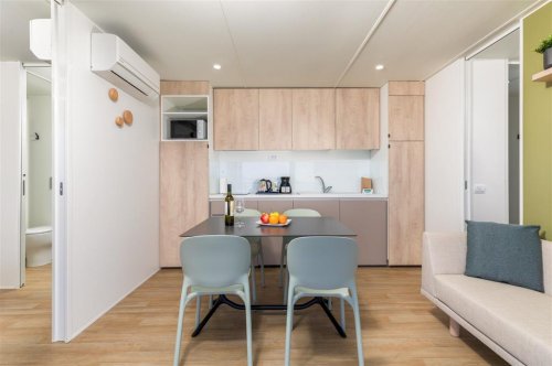 Je vybaven vlastním sociálním zařízením, obývacím pokojem s kuchyňským koutem, ložnicí s manželským lůžkem, ložnicí se dvěma samostatnými lůžky a 3. lůžkem s žebříkem (3. lůžko má rozměry 70×195 cm) a terasou s posezením. V mobilhomu je k dispozici klimatizace, SAT/TV a povlečení a ručníky. Při rezervaci je možné si vybrat i mobilhome orientovaný na stranu moře (neznamená výhled na moře).