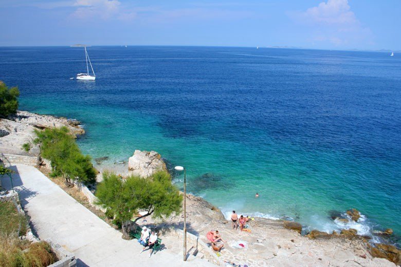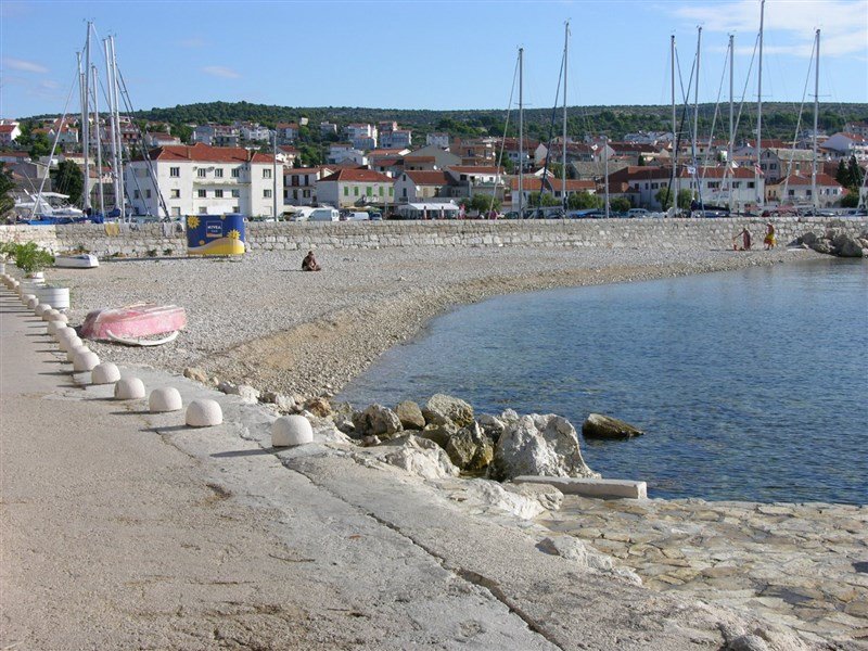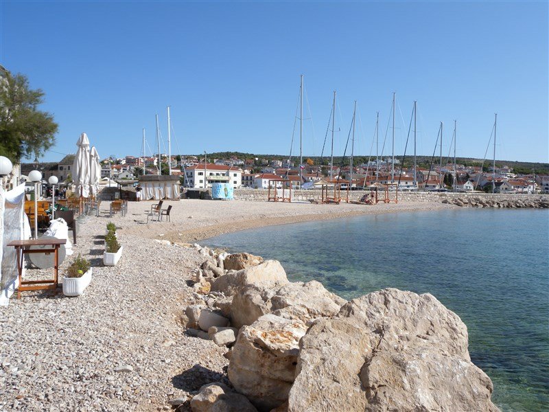 100 m, oblázková s pozvolným vstupem do moře nebo skalnatá přírodní plata.