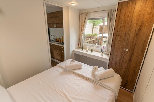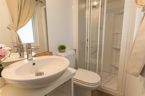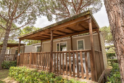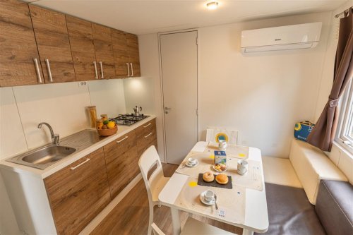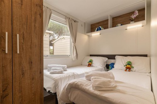 Prostorný mobilhome o velikosti cca 34 m² nabízí tři samostatné ložnice, dvě koupelny, kuchyňský kout s lednicí, mikrovlnnou troubou, nádobím a jídelním prostorem, klimatizaci a TV. Součástí je také krytá veranda se stolem a židlemi pro venkovní posezení. Tento typ ubytování není určen pro pobyt se zvířaty. Ubytování umožňuje pobyt s domácím mazlíčkem (na vyžádání). Maximální obsazenost je 6 osob.