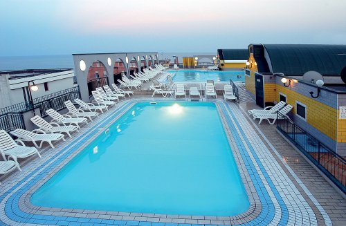 Výtah, venkovní střešní bazén s částí pro děti a sluneční terasou s panoramatickým výhledem, parkoviště