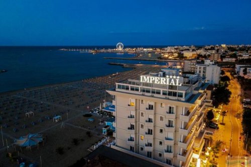 Oblíbený 4* hotel Imperial Beach hotel se nachází v Rivabella di Rimini, přímo na pláži, bez přecházení silnic, nedaleko centra Rimini. Placené parkoviště, výtah, restaurace je zcela v „imperiálním“ stylu, luxusní a pohodlná, s nádherným výhledem na moře, a nabízí rafinovanou a vytříbenou mezinárodní kuchyni, střídající se s tradičními pokrmy z oblasti Romagna. Snídaně, obědy a večeře s asistovanou obsluhou formou bufetu. Nápoje k jídlu na čepu (voda, coca cola, limonáda, oranžáda, víno, pivo). Otevřený bar od 7.30 do půlnoci (nealkoholické nápoje na čepu, pivo, káva). Animace s miniklubem 4/8 let a Junior klubem 9/12 let, v hotelu a na pláži každý den od 18. 6. do 3. 9. (kromě neděle).