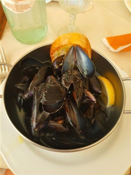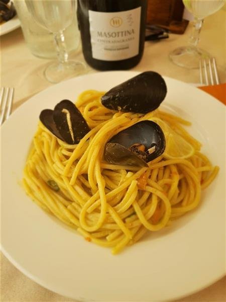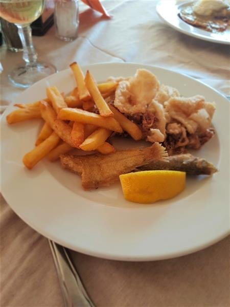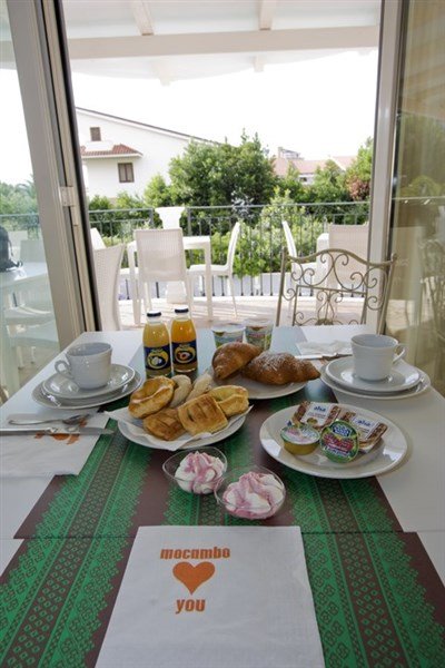 Polopenze. Snídaně formou bufetu; večeře servírované, výběr z několika menu 1. a 2. chodu, salát, 1/2 l vody a sklenice vína/os. v ceně. Stravování probíhá v restauraci na pláži vzdálené cca 50 m.