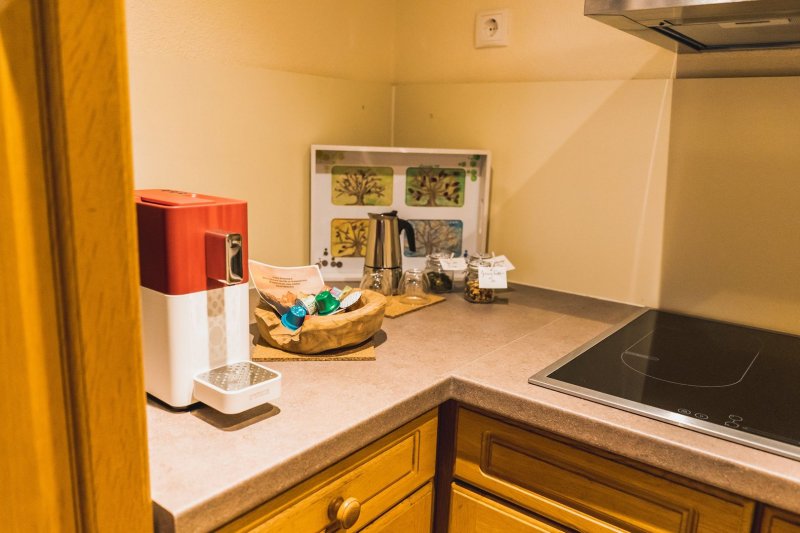 - kuchyňská linka: myčka nádobí, sporák, kávovar, lednice, mikrovlnná trouba a rychlovarná konvice