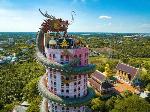 Wat Sam Phran, přezdívaného Dračí chrám, kde se kolem budovy vine
