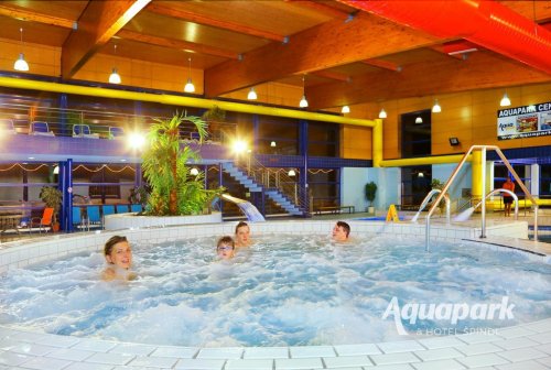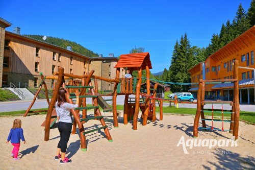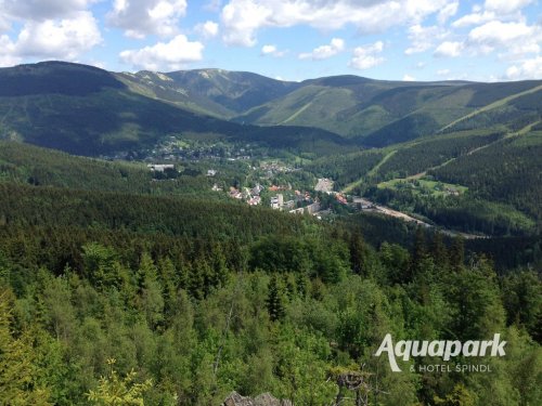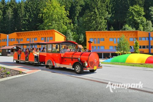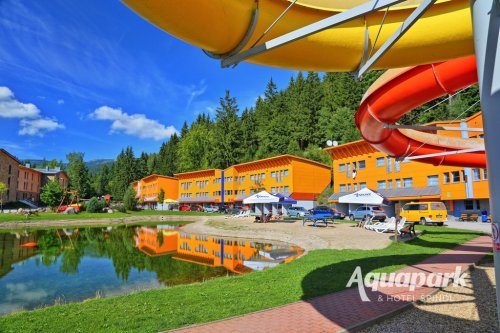 Hotel Aquapark leží v srdci Krkonoš ve Špindlerově Mlýně. Jedná se o komplex 9 penzionů s restaurací, budovou aquaparku, wellness centrem a solnou jeskyní. Hotel se nachází jen 50 metrů od skiareálu Medvědín, je tak ideální volbou nejen pro letní dovolenou na čerstvém vzduchu, ale i zimní radovánky. Aquapark nabízí relaxaci a zábavu pro celou rodinu. Mezi vodní atrakce patří 3 tobogány, divoká řeka s protiproudem, rekreační bazén, malá a velká vířivka, dětská skluzavka, perličková masážní lůžka a nechybí ani relaxační zóna s lehátky. Ve wellness centru naleznete saunu, parní lázeň, solnou infrasaunu, ochlazovací bazének, odpočinkovou zónu, solnou jeskyni. Objednat si můžete také masáže.