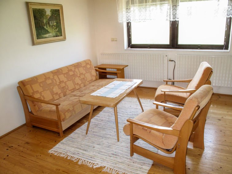 4-pokojová polovina dvojdomku 120 m2 na 2 podlažích. Účelné zařízení: obývací pokoj/jídelna 30 m2 s TV-satelit a rádio. 1× pokoj s 1× dvoulůžko. Kuchyňský kout (4 plotýnky, trouba, myčka, mikrovlnka, mraznička, elektrický kávovar). Koupelna/sprcha, bidet, WC zvlášť. Plynové topení. V horním patře: 1× zkosený pokoj 30 m2 s 3× lůžko a WC zvlášť. 1× zkosený pokoj s 1× lůžko a 1× dvoulůžko. Vstup na lodžii. WC zvlášť. Pěkný výhled na krajinu. K dispozici: pračka, dětská postýlka. Pozor prosím: nekuřácký dům. Maximálně 1 domácí zvíře (pes) povoleno. Pokoj v patře průchozí do pokoje s lodžií.