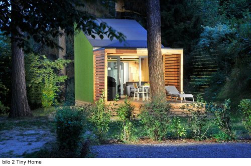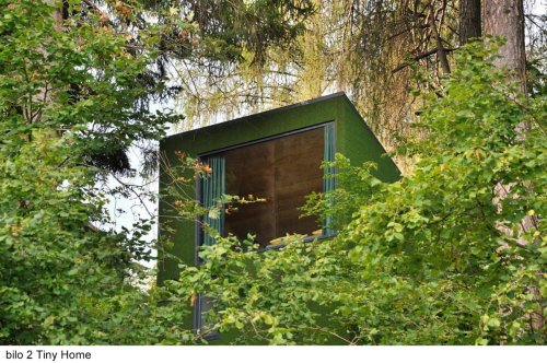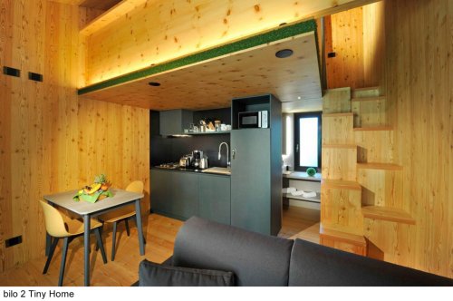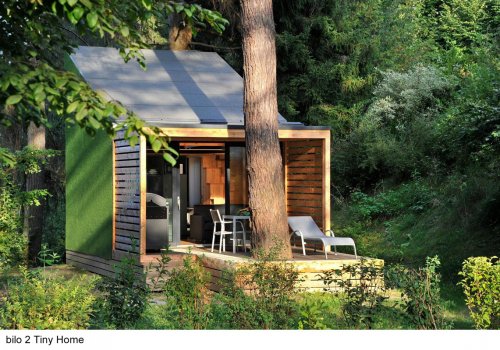 volně stojícími dřevěnými domečky Tiny home, centrální budovy