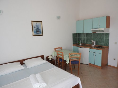 Studia pro 2, 3 nebo 3+1 osobu: studia se nacházejí výhradně v 1. nebo 2. patře. Každé studio má manželské lůžko a případně lůžko pro 3. a 4. osobu, vlastní koupelnu se sprchou a WC, soukromý balkón nebo terasu s posezením, vybavený kuchyňský koutek s chladničkou, který je umístěn přímo ve studiu nebo na terase, klimatizaci (používání zahrnuto v ceně). Studia jsou orientována buď směrem na pohoří Biokovo nebo směrem na město..