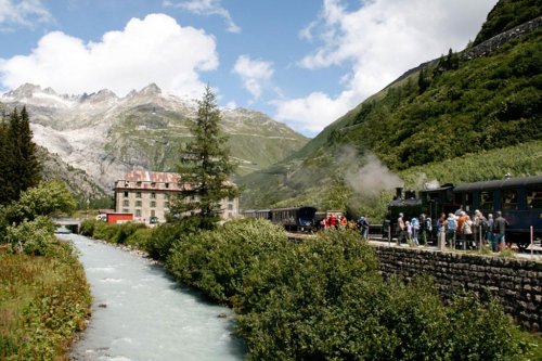 Snídaně. Odjezd údolím Prättigau do údolí Rýna. Proti toku Rýna až do Reichenau, kde je soutok Zadního a Předního Rýna. Cesta pokračuje údolím Surselva proti toku Předního Rýna a stoupá až do průsmyku Oberalp (2044 m n.m), v jehož blízkosti Rýn pramení. Z průsmyku Oberalp se sjede až do Andermattu a po krátké cestě do Realpu se hned začne stoupat mnoha serpentinami do průsmyku Furka (2431 m n.m.). Při klesání se otevře mohutný horský kotel, vpravo ledovec Rhonegletscher s prameništěm Rhony, dole vesnička a nádraží Gletsch a v pozadí vinoucí se cesta na další z průsmyků Grimsel. Po sjezdu do Gletsche následuje další sjezd podél již mohutnící Rhony na nádraží do Oberwaldu. V Oberwaldu je již připravován historický parní vlak. Před nástupem je dostatek času na fotografování. Poté následuje více než dvouhodinová jízda historickou ozubnicovou železnicí “Furkadampfbahn” , vagony jsou taženy historickou parní lokomotivou. Nejdříve vlak vystoupá tunelovou smyčkou do Gletsche v horském kotli pod průsmyky Grimsel a Furka, poté stoupá okolo ledovce Rhonegletscher a vrcholovým tunelem dojede do stanice v průsmyku Furka (2163 m n.m.). Z průsmyku Furka vlak začne klesat, hluboká údolí přejíždí po mostech, některé z nich jsou kvůli lavinám v zimním období originální „skládací“ konstrukce. V cílové stanici Realp jíž čeká náš autobus a následuje cesta zpět na hotel. Večeře. Nocleh.