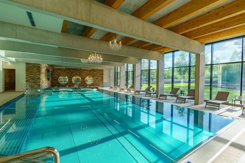 vnitřní bazén 17×9 m s masážními tryskami a vodním barem, venkovní