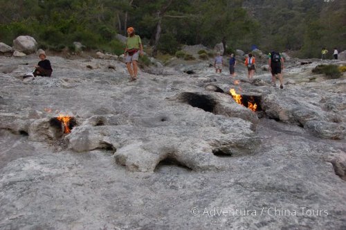 4. denEtapa vnitrozemím: mezi skalami, lesy a vesnicemi nastoupáme od moře až do 650 m a pak se zase spustíme zpět do sympatického malého letoviska Çirali s nekonečnými plážemi a neuvěřitelnou vyhlídkou na monumentální štít Tahtalı Dağı (2366 m); podvečerní vyjížďka a pak kousek pěšky k tzv. Chiméře, přírodnímu úkazu v podobě plamenů šlehajících ze země (jev byl popsán už v antice a pojmenován podle příšery řecké mytologie Chiméry) – turecky se místo nazývá Yanartaş čili „hořící skála“ (40 km / ↑700 m).