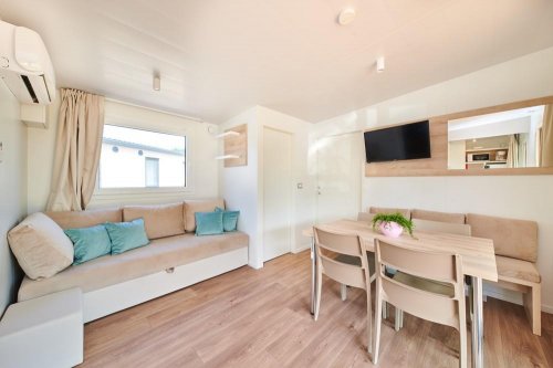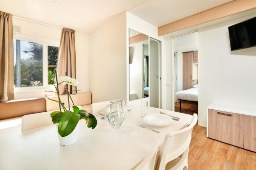 Mobilhome typu Superior o výměře cca 34 m2 se skládá se ze dvou ložnic (jedna s manželským lůžkem a druhá s dvěmi oddělenými lůžky), obývacím pokojem s rozkládací pohovkou pro max. 2 děti, plně vybavenou kuchyní, 2 koupelnami a terasou s venkovním posezením. Dále disponuje klimatizací, fénem, SAT/TV a WiFi připojením. Maximální obsazení mobilhomu je 4 dospělé osoby a dvě děti do 11,99 let.