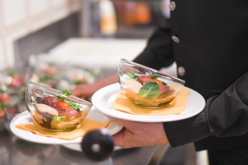 teplý předkrm, hlavní chod (možnost volby vegetariánského nebo masového)