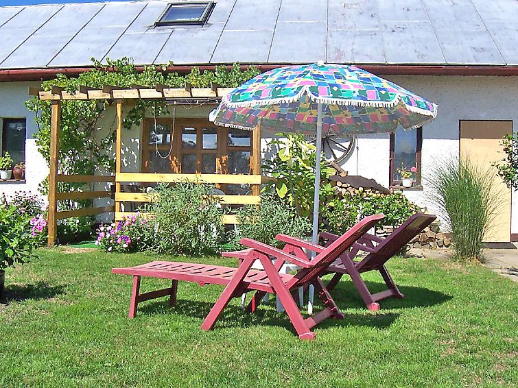 2-pokojový dům 56 m2. Účelné a pěkné zařízení: obývací pokoj/jídelna s krbová kamna, TV-satelit a rádio. Vstup na zahradu, k bazénu. Kuchyňský kout u vstupu (4 plotýnky, malá trouba, mikrovlnka, mraznička, gril, elektrický kávovar). Sprcha/WC. E-topení. V horním patře: (přikré schodiště) 2× zkosený pokoj, v kazdem pokoji s 2× lůžko. Parkování. Pozor prosím: nekuřácký dům. Schody do patra jsou hodně příkré a točité. Stropy v prvním patře jsou silně zkosené.