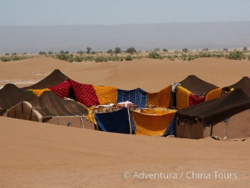 4. denDále podél řeky Dráa, postupně se ztrácející v poušti: berberské městečko Tamegroute – místo súfijského učeného bratrstva násiríjá ze 17. století, knihovna Koránu, v níž bývalo přes 40 tisíc knih a písemností, dílna tradiční „zelené" keramiky; noc v poušti přímo pod nejrozsáhlejšími marockými písečnými dunami – Chigaga, výstup na duny pěšky, nebo v sedle velblouda; večeře pod hvězdami.