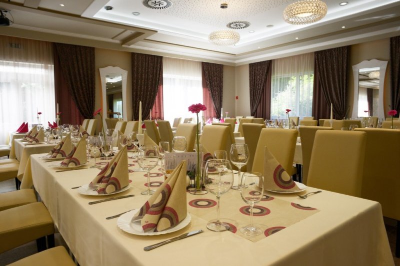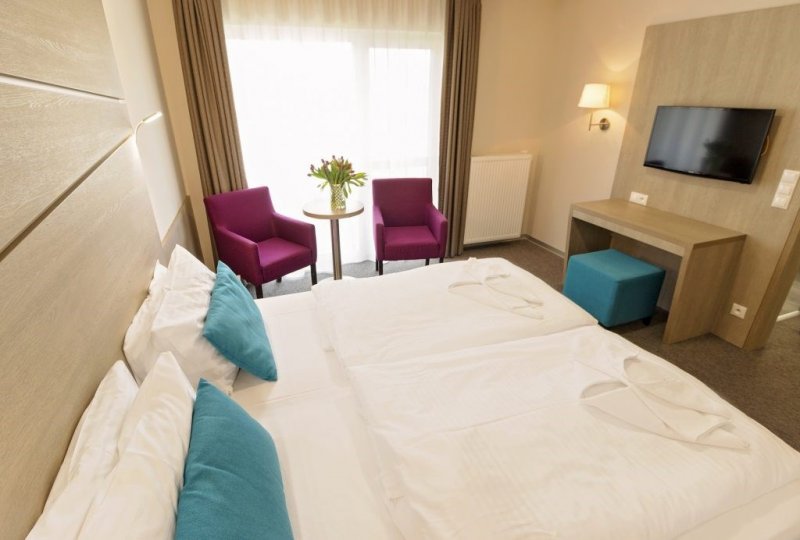 Hotel se nachází v zalesněném lesoparku cca 80m od areálu termálních lázní Corvinus.