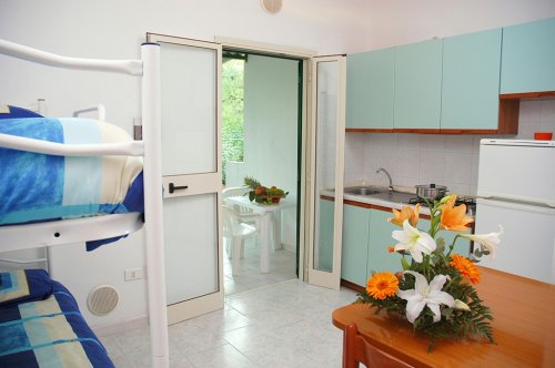 apartmány TRILO pro 5/6 osob - všechny 5/6 lůžkové zděné bungalovy mají samostatný vchod, Skládají se z kuchyňského koutu, rozkládací pohovky nebo patrové postele, ložnice (s manželskou postelí), ložnice se 2 samostatnými lůžky s možností přistýlky, koupelny se sprchovým koutem, kryté a vybavené veranday, klimatizace (za příplatek). Třípokojové apartmány mají plochu cca 45 m2 + 15 m2 veranda. Vhodné pro rodiny a malé skupiny přátel.