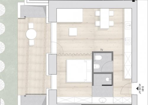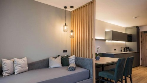 Apartmán o rozloze 38–45 m2 je vhodný pro 2–4 osoby. Mezi vybavení apartmánu patří manželská postel, pohodlná rozkládací pohovka, velká TV, koupelna, oddělená toaleta, fén, lodžie s posezením, plně vybavená kuchyňka se sporákem, mikrovlnkou s funkcí na pečení, lednicí, myčkou, nádobím.