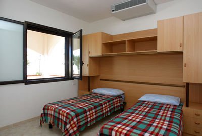 řadové přízemní nebo jednopatrové zděné vilky typu trilo A a B pro 4 osoby (45 m2+ veranda 18 m2) – ložnice s manželskou postelí, ložnice se 2 samostatnými lůžky, obývací místnost s kuchyňským koutem, TV, koupelna a WC, klimatizace (cca 13.06.-31.08.), možnost přistýlky za příplatek, některé mají pračku (typ A a B 400 m od moře).