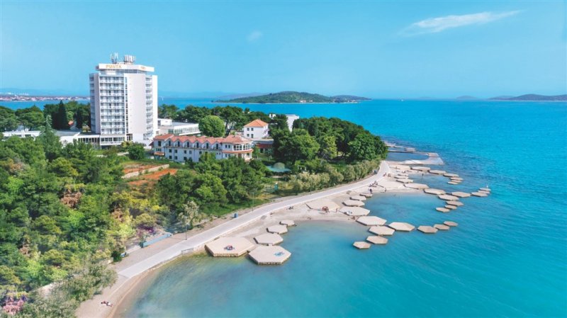 V těsné blízkosti centra letoviska Vodice na poloostrově Punta – v objetí zeleně a piniového parku – 100m od moře – u oblázkové pláže s upravenými betonovými deskami na slunění – cca 200m od známé písečné pláže s příměsí kamínků Plava plaža vhodné pro děti či neplavce