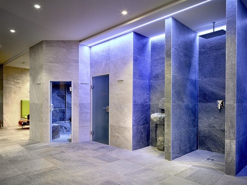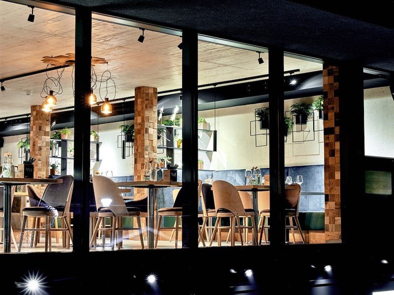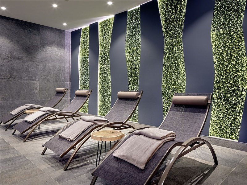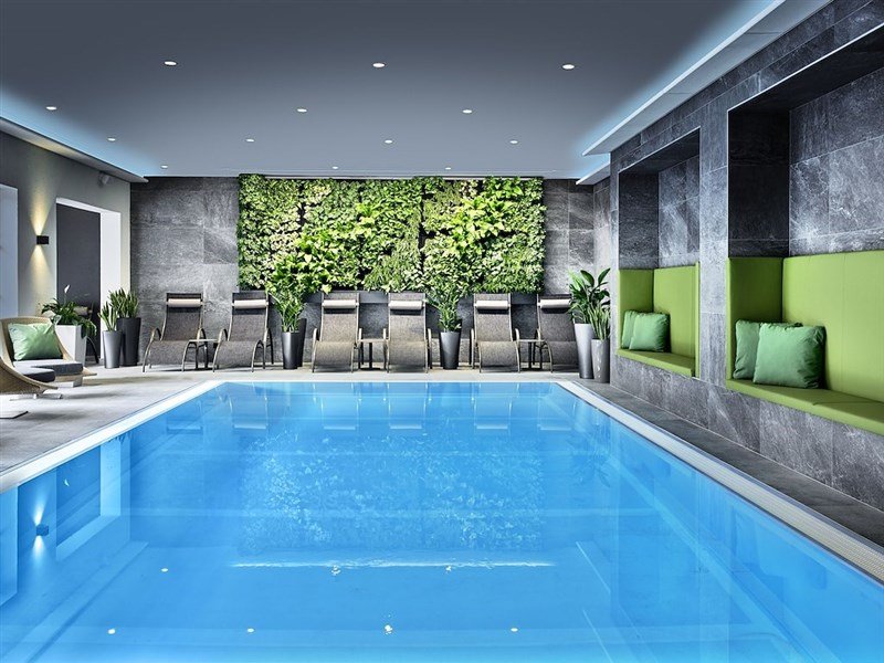 Wellness zóna s vnitřním bazénem a saunovou částí (otevřena 15–21 h.): finská sauna, biosauna, parní lázeň, bazének na schlazení, relaxační zóny. Fitness 9–20 h.